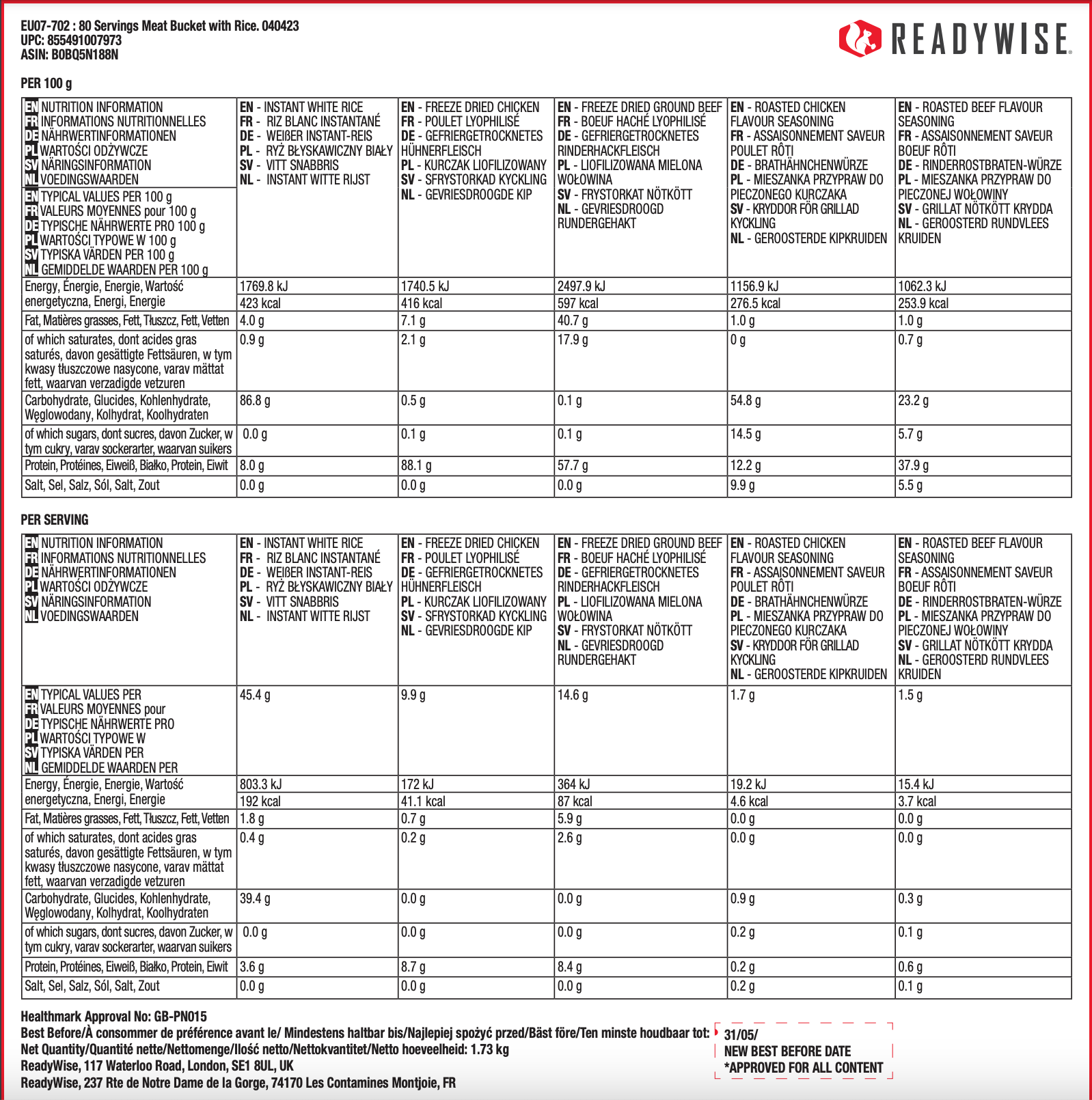 Secchio da 80 porzioni di carne e riso, liofilizzato, fino a 15 anni