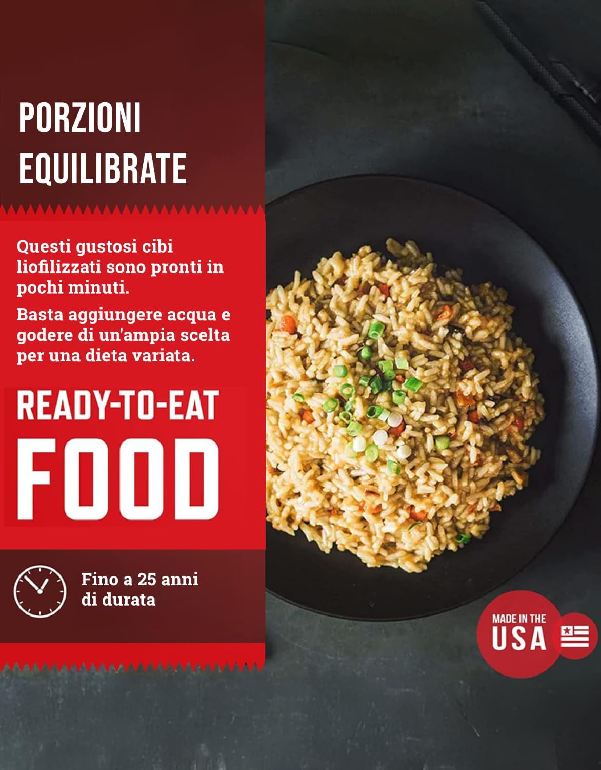 - SIATE PRONTI: dal razionamento del cibo di emergenza all'escursionismo e al campeggio, il nostro cibo a lunga conservazione è a vostra disposizione.