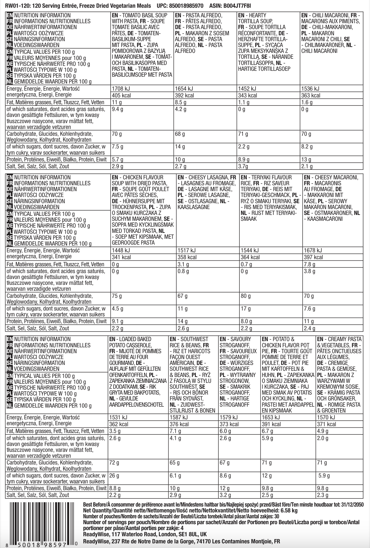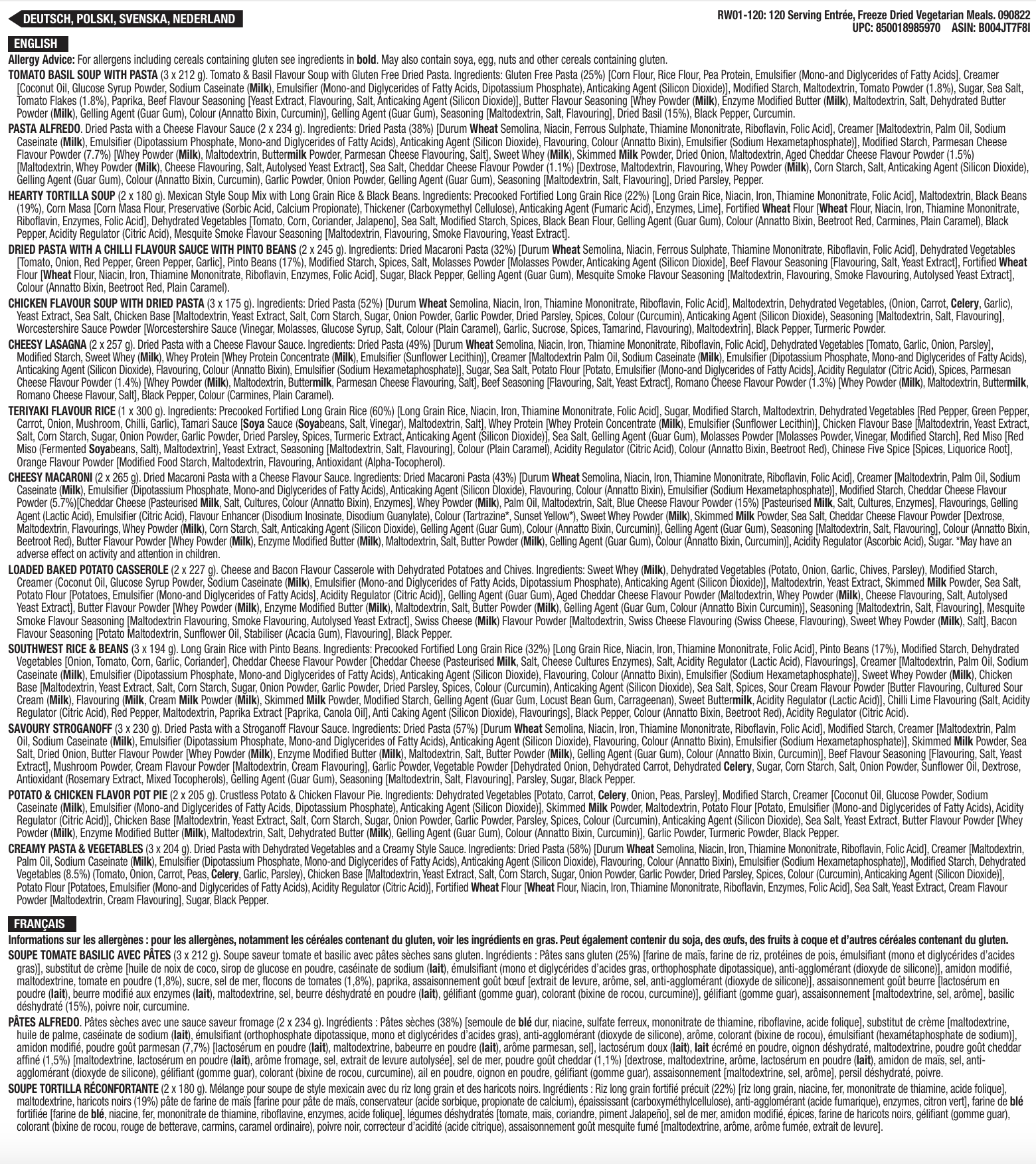 120 porzioni di antipasti, pasti vegetariani liofilizzati, fino a 25 anni