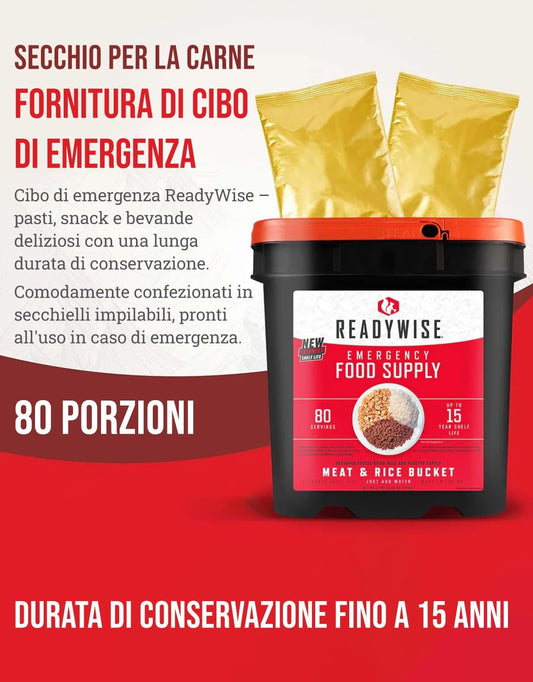 Secchio da 80 porzioni di carne e riso, liofilizzato, fino a 15 anni